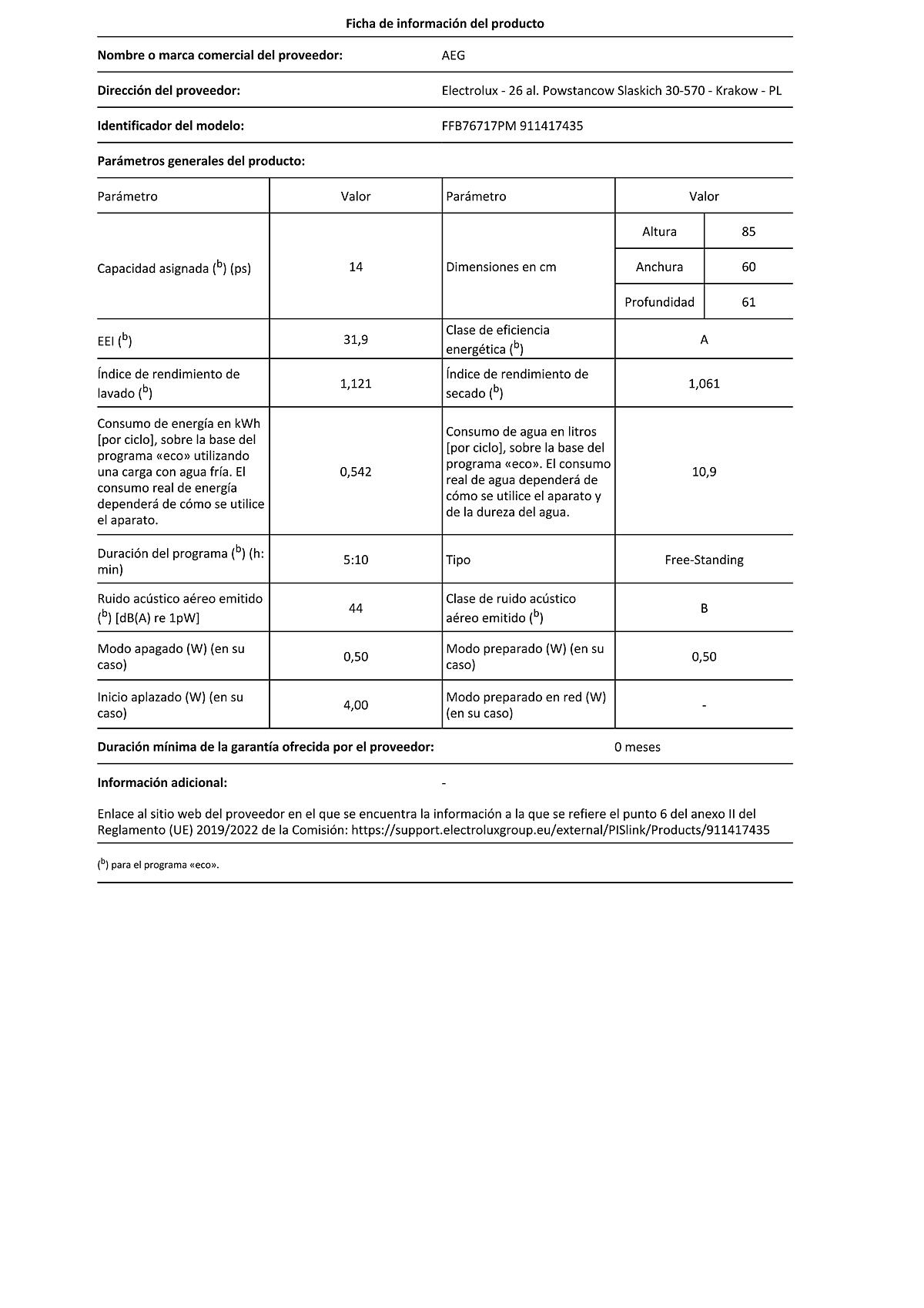 | Consumo de energía del programa eco en kW/h por ciclo (EU 2017/1369) |