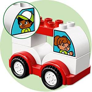 Settet inneholder en byggbar racerbil på et LEGO DUPLO hjulunderstell.