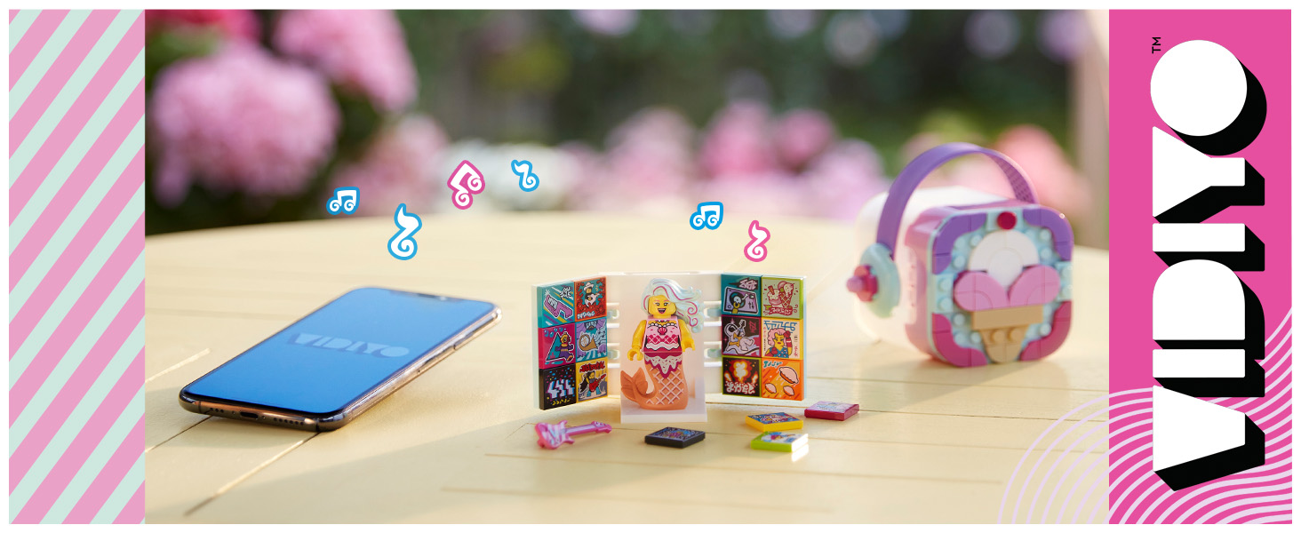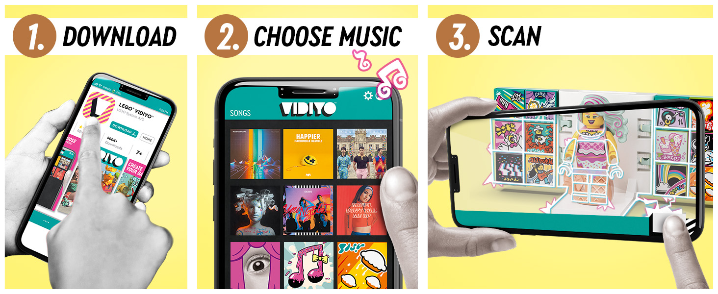 It’s easy to get started. Download the VIDIYO™ app to choose from a range of popular songs. Then scan the VIDIYO minifigure and BeatBits to unlock special effects as kids perform and direct their music videos.