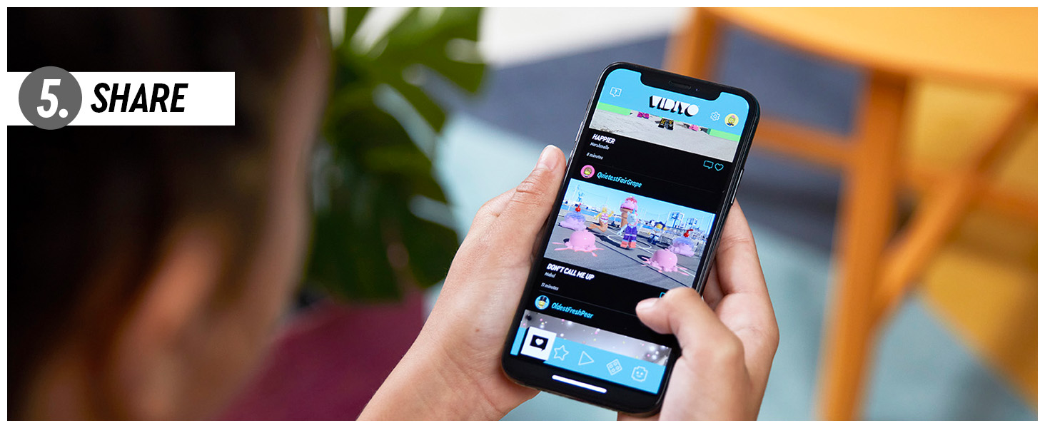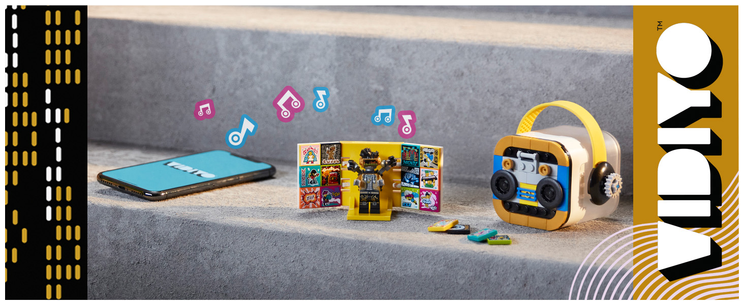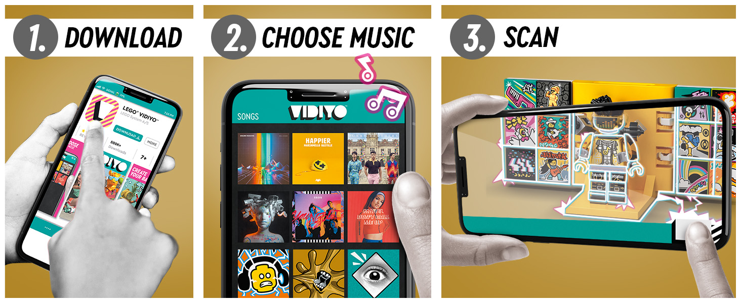 It’s easy to get started. Download the VIDIYO™ app to choose from a range of popular songs. Then scan the VIDIYO minifigure and BeatBits to unlock special effects as kids perform and direct their music videos.