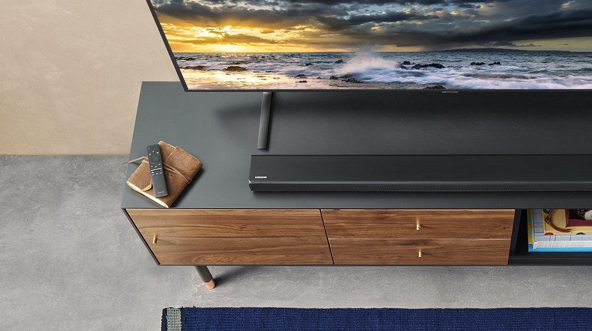 No necesitas varios mandos a distancia. Controla las funciones de la barra (encendido, volumen y efectos de sonido) con el mando a distancia desde el menú de tu televisor Samsung.