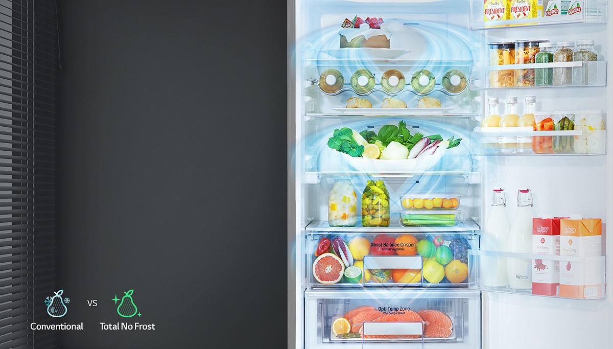 The LG Total No Frost System lets you store food with maximum freshness. The system cools food faster than conventional cooling mechanism, ensuring food safety. Plus, cool air is evenly distributed to all areas of the fridge so that food can be maintained fresher for longer, even over the long term.