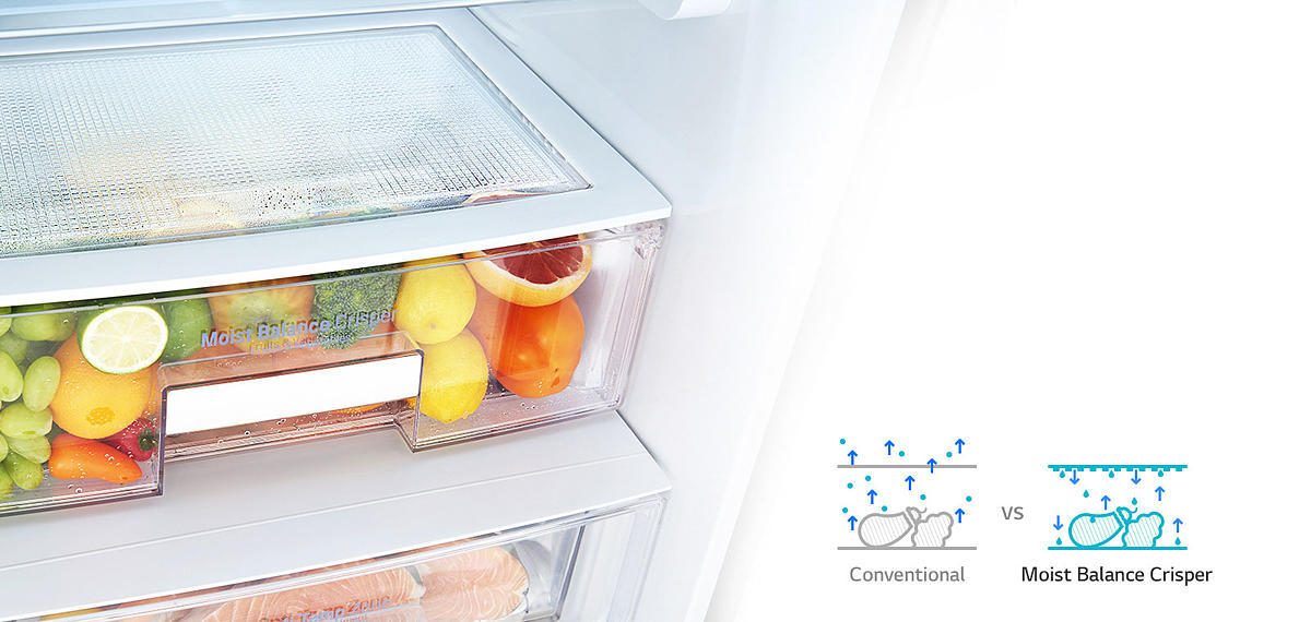 The Moist Balance Crisper’s unique lattice top maintains optimal humidity to keep vegetables crisp and fresh.